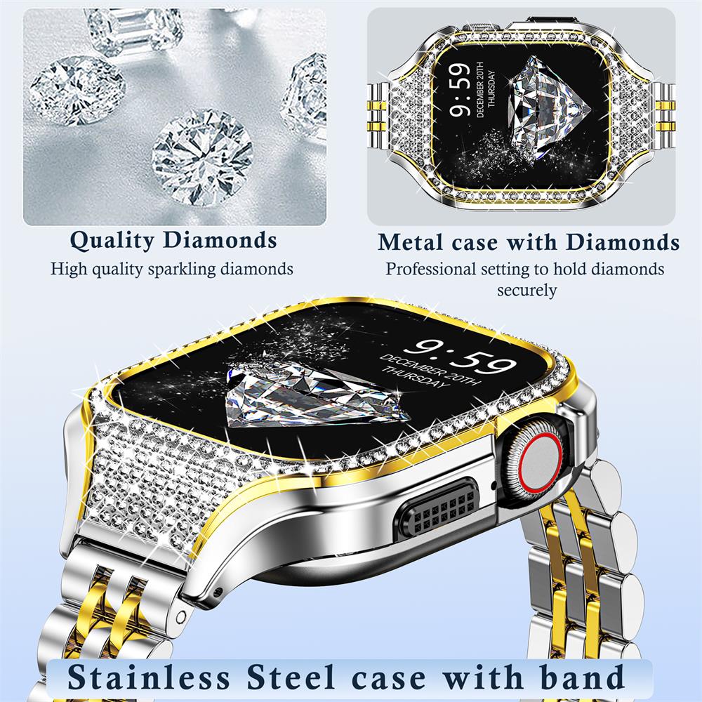 [✨Bling Case with band design] The stainless steel case set with shiny rhinestones is eye-catching when paired with the smooth steel band. The TPU bumper layer embedded in the diamond case is shockproof and drop-proof. This case and straps provide effective protection and beautiful dressing for your iwatch.